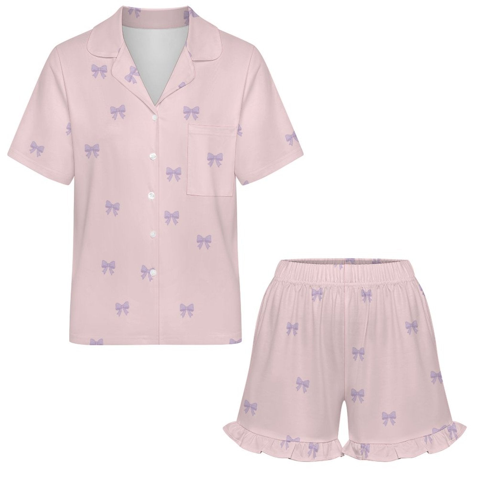 - Thoughtful Design: This Ruffled Short-Sleeve Pajama Set features a classic V-neck collar with a soft touch and button closure for easy on and off. The shorts legs also have ruffles, ensuring no waist or leg tightness. The side pockets are convenient for stashing your phone or hair tie, making it super easy to lounge at home and watch dramas.